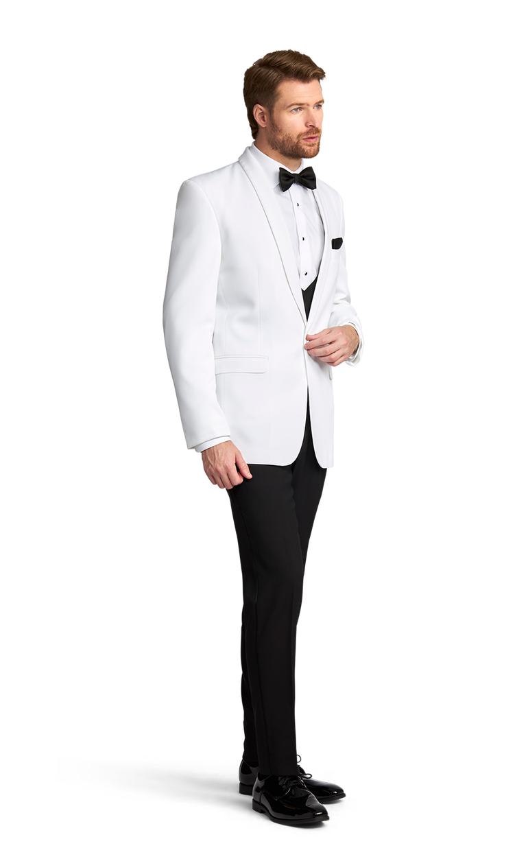 This charming slim white one-button dinner jacket featuring a white shawl-style lapel offers a sleek and conventional style. Completely customize your style and look with any number of pants, shirt, tie, and shoe combinations to create a style that's uniquely you.