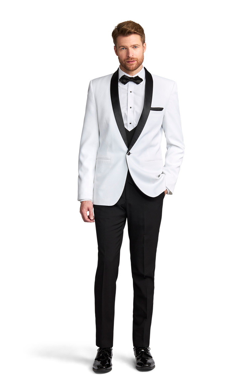 Dress to impress with this slim fit one-button white tuxedo featuring a black satin lapel. Pair with one of our patterned bow ties or long ties to create a unique event look. Completely customize your style and look with any number of pants, shirt, tie, and shoe combinations to create a style that's uniquely you.